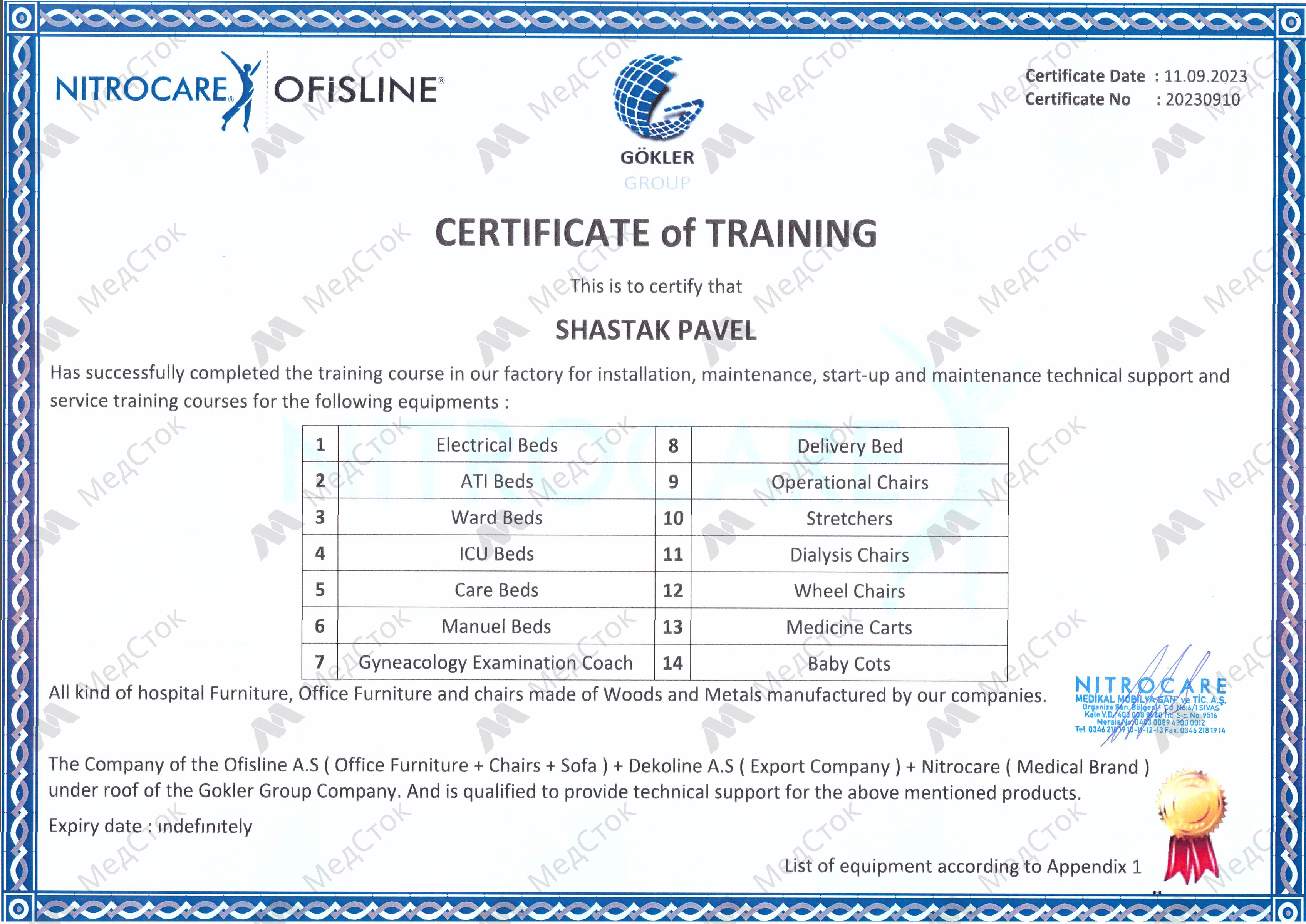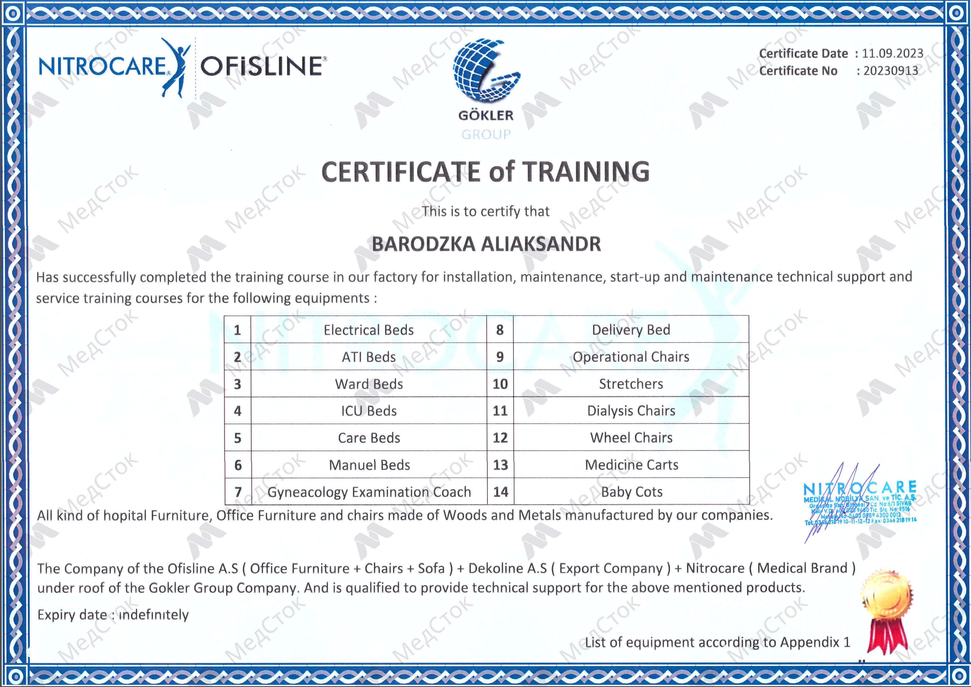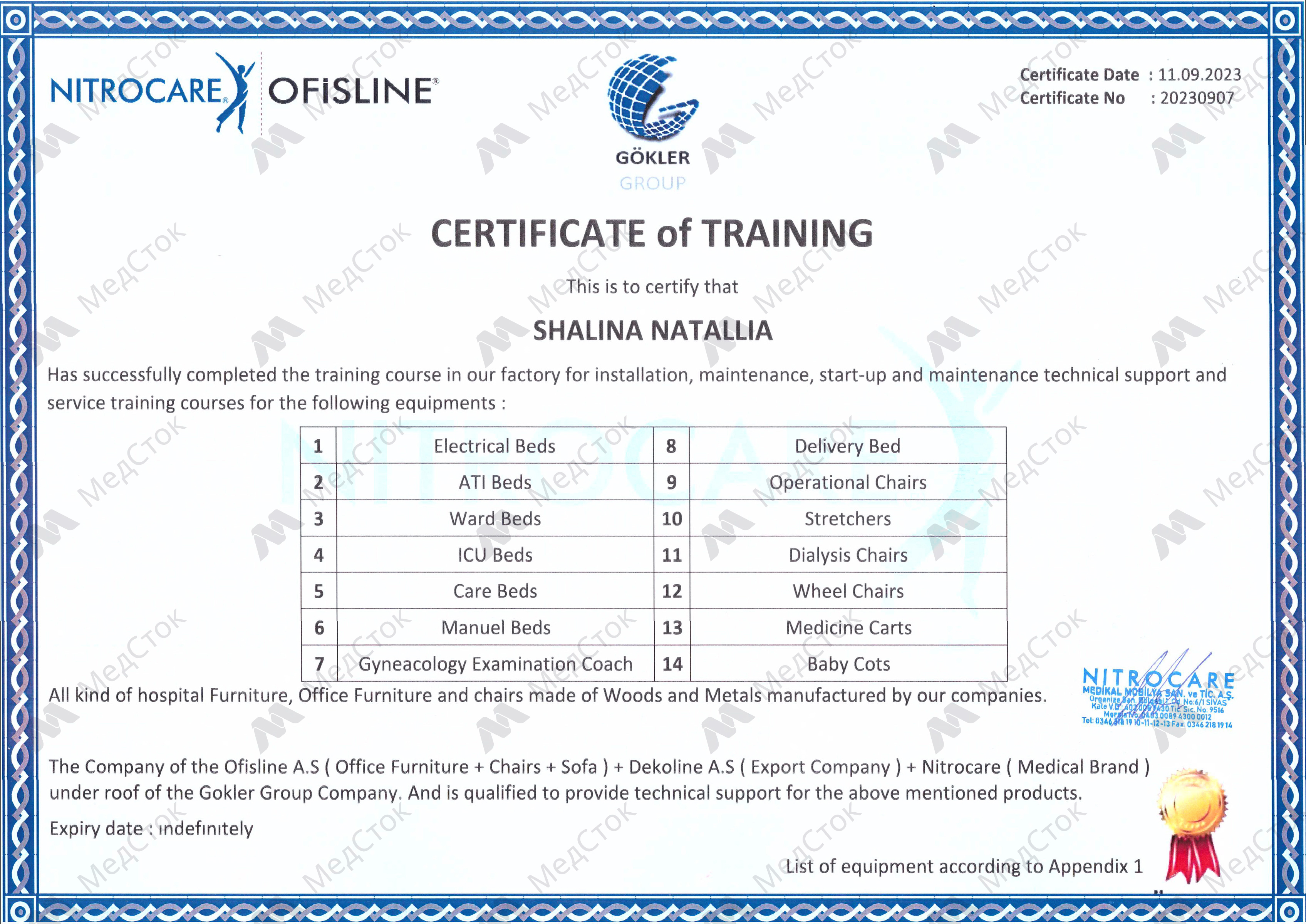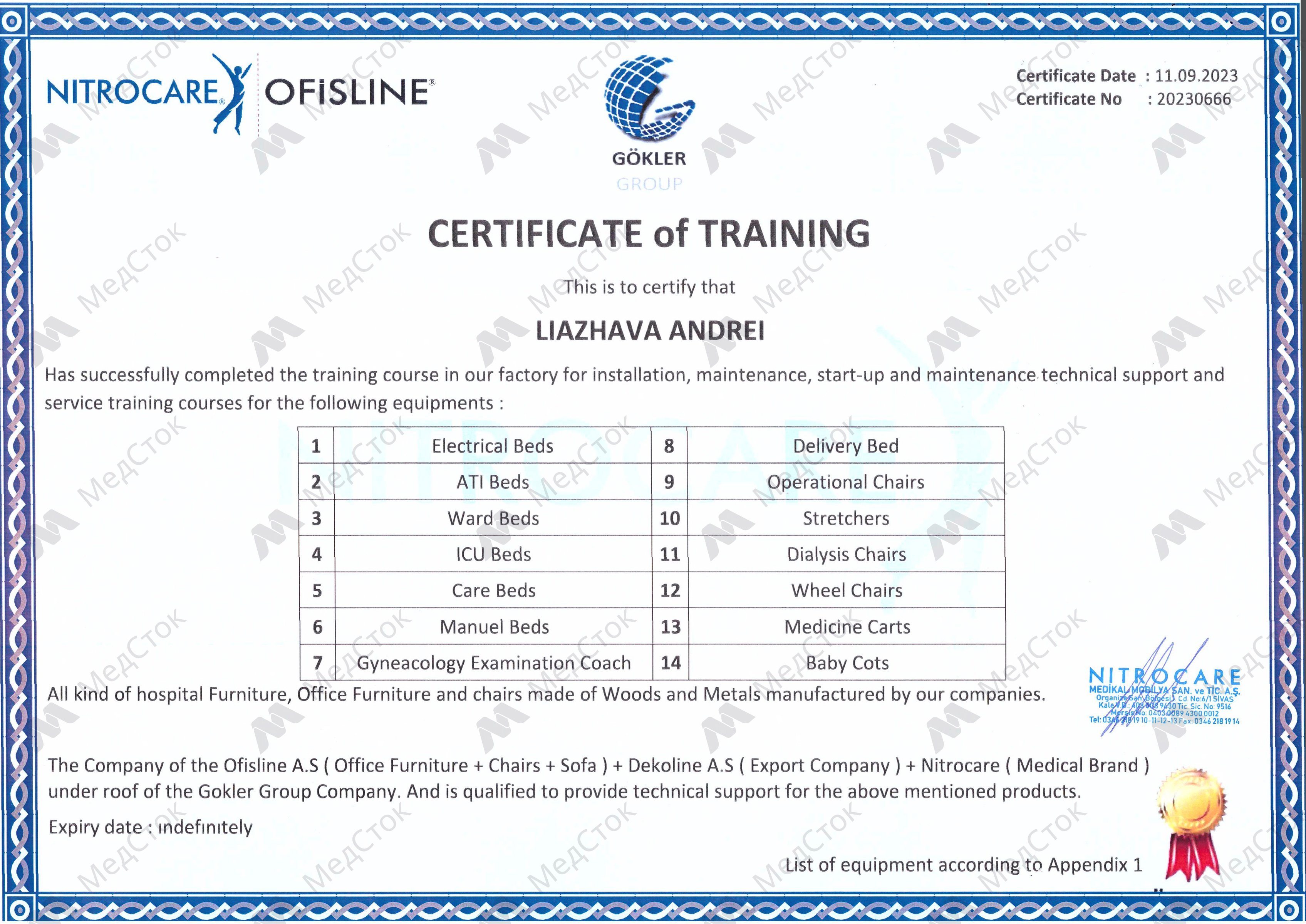 Сертификат обучения на техническое обслуживание и ремонт медицинской техники