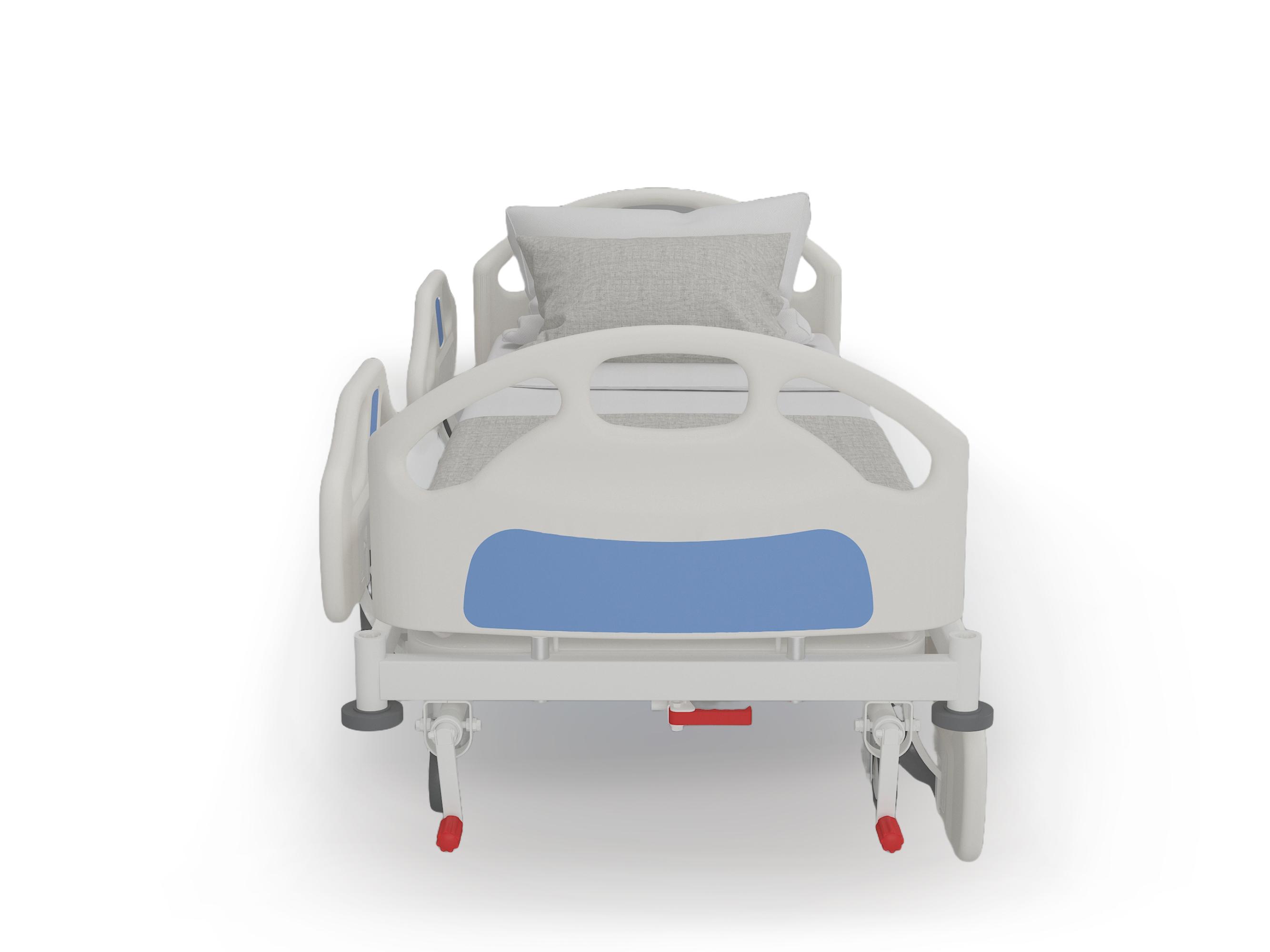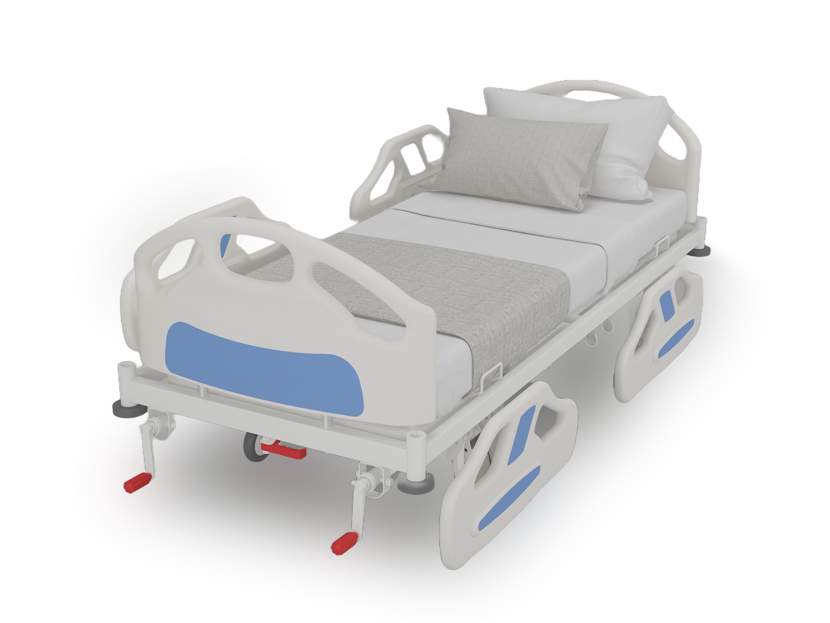Она оснащена регулировкой секции головы и подножки, а также ручной регулировкой положения Фаулера и васкулярного. Съемное изголовье и изножье выполнены из АБС-пластика, боковые ограждения также из АБС-пластика. Кровать имеет поворотные колеса диаметром 125 мм с линейным тормозом, вертикально регулируемую стойку для капельниц и держатель для мочеприёмника. Поверхность выполнена в виде металлической решётки. Матрац в комплект не входит.