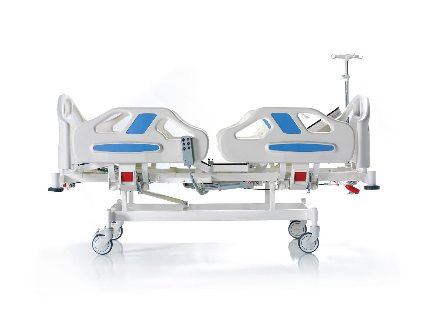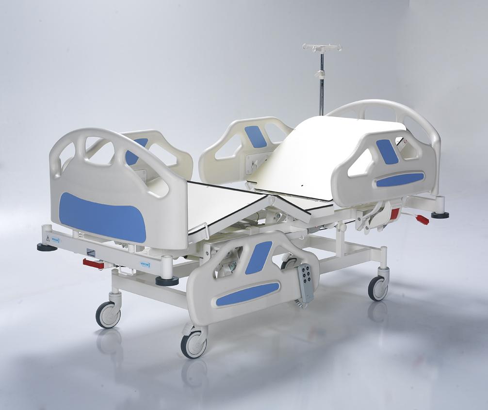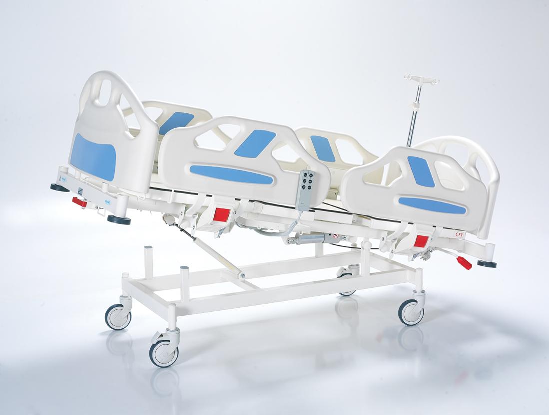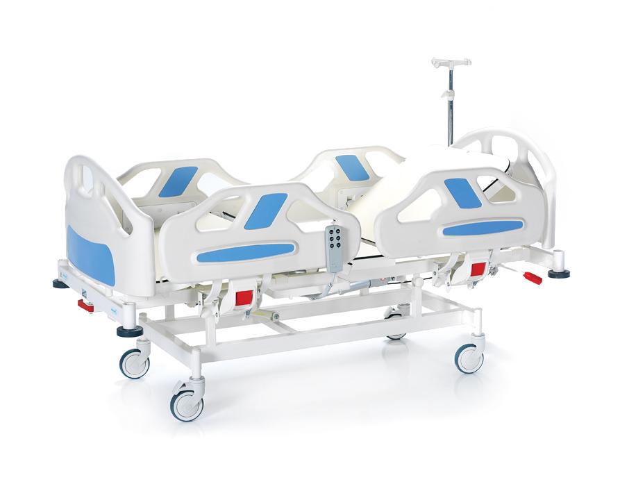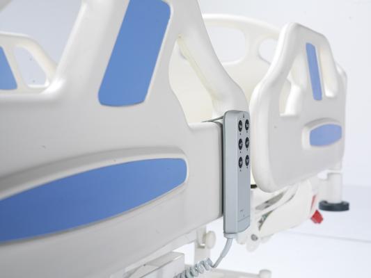 Кровать оснащена регулируемыми боковыми ограждениями, съемным изголовьем и изножьем, а также функциями Тренделенбурга и Анти-Тренделенбурга. Поверхности выполнены из HPL, диаметр колес – 125 мм. Оснащена линейным тормозом, поворотом на 360°, механической системой CPR и телескопической инфузионной стойкой. Матрац в комплект не входит.