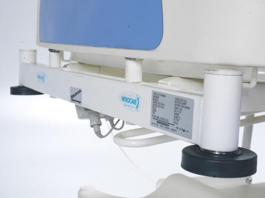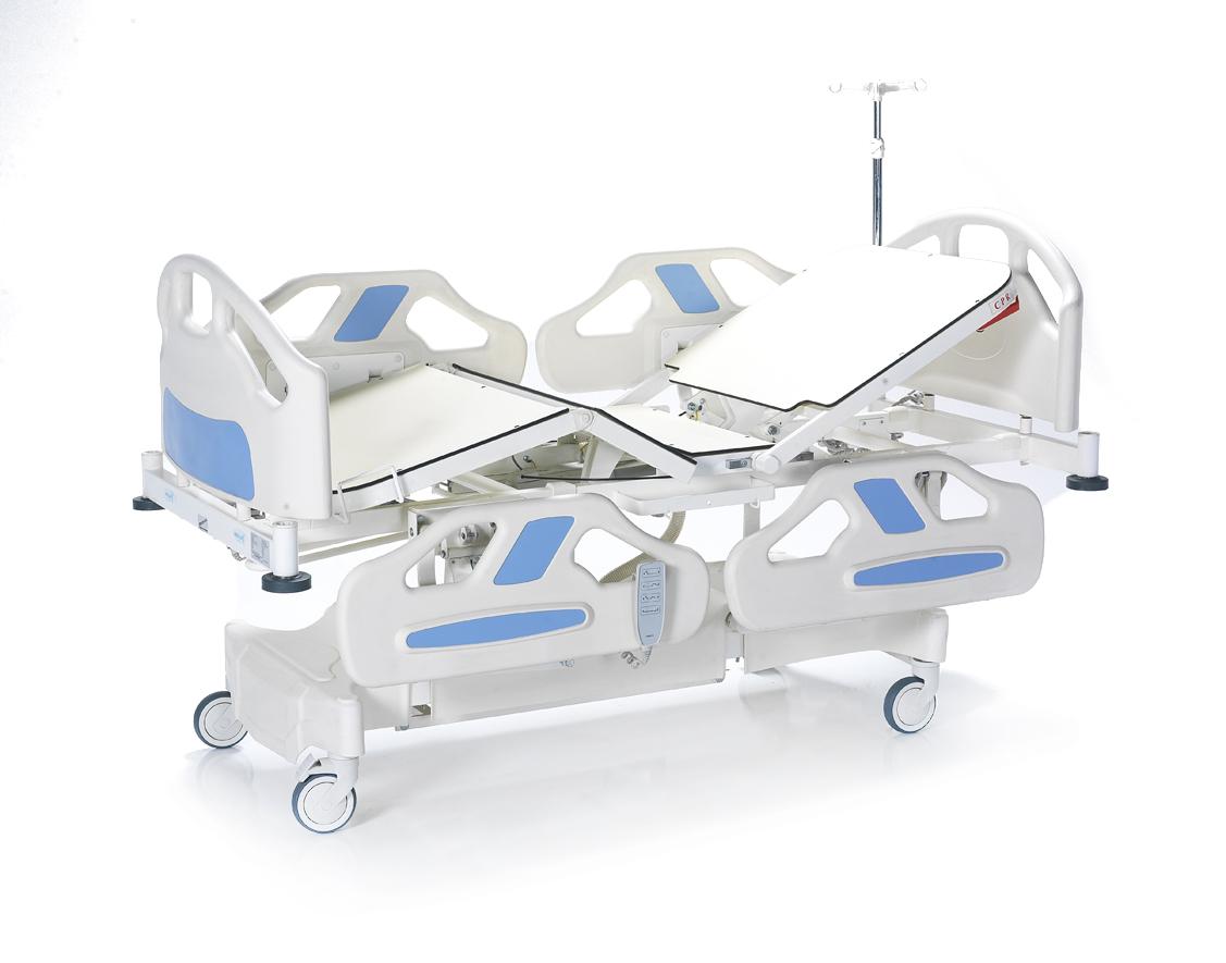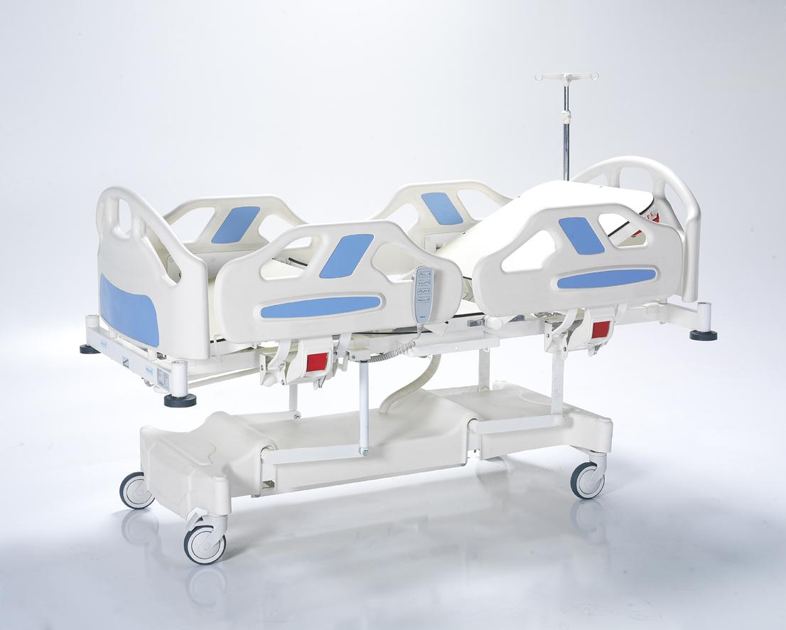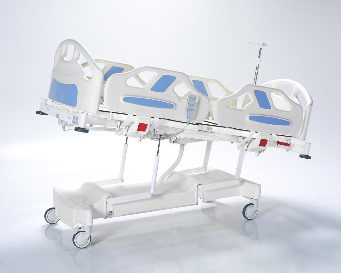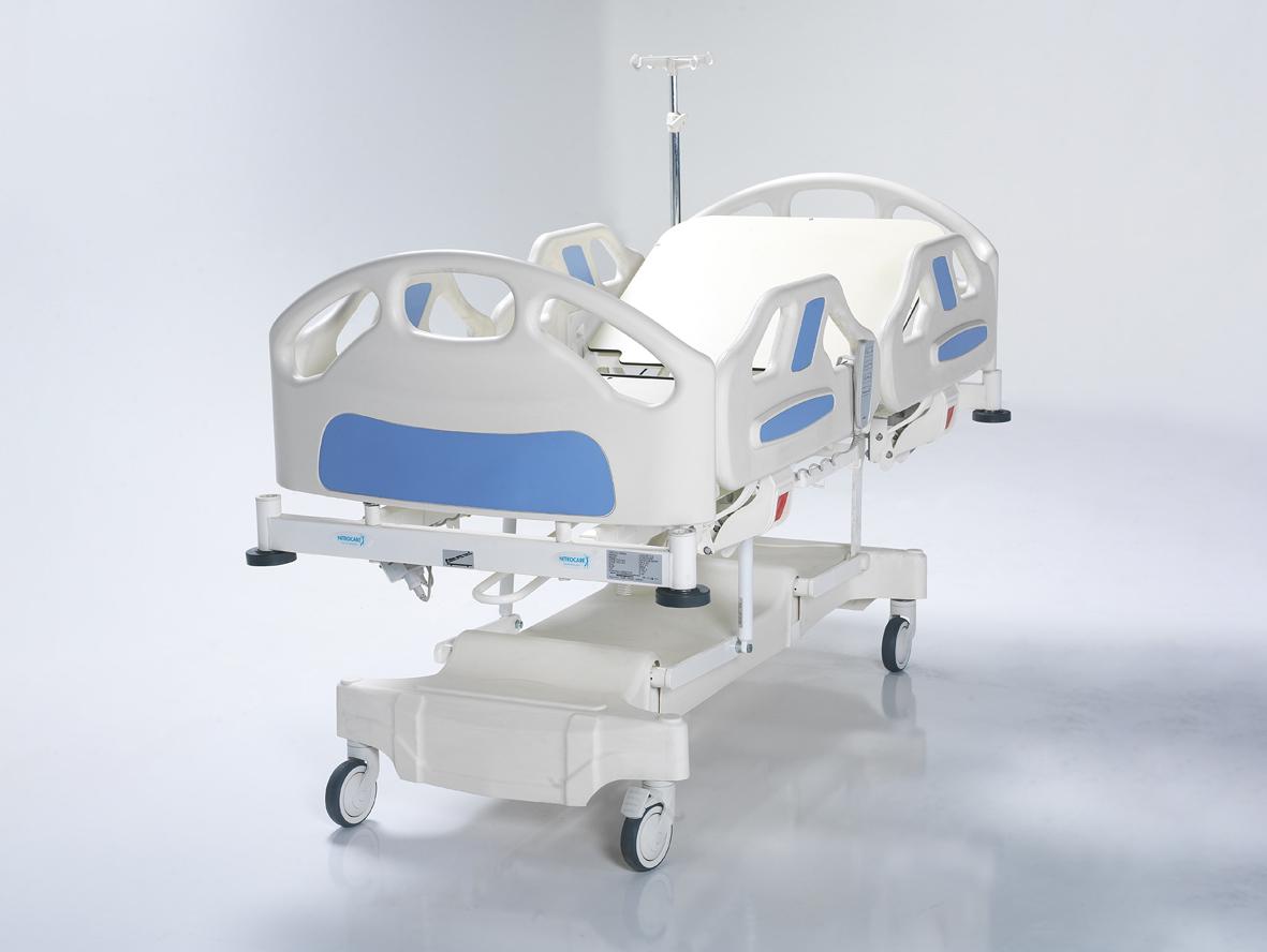 Кровать оснащена регулируемыми боковыми ограждениями, съемным изголовьем и изножьем, а также функциями Тренделенбурга и Анти-Тренделенбурга. Поверхности выполнены из HPL, диаметр колес – 125 мм. Оснащена линейным тормозом, поворотом на 360°, механической системой CPR и телескопической инфузионной стойкой. Матрац в комплект не входит.