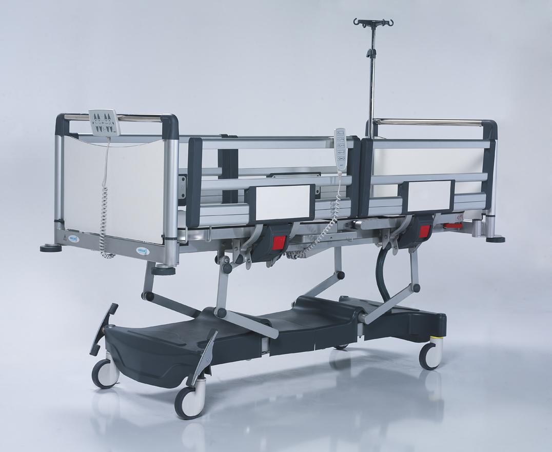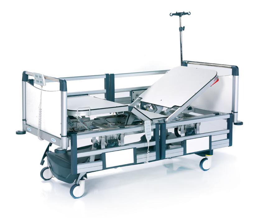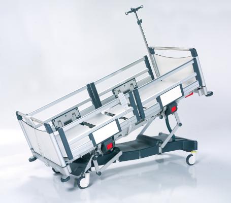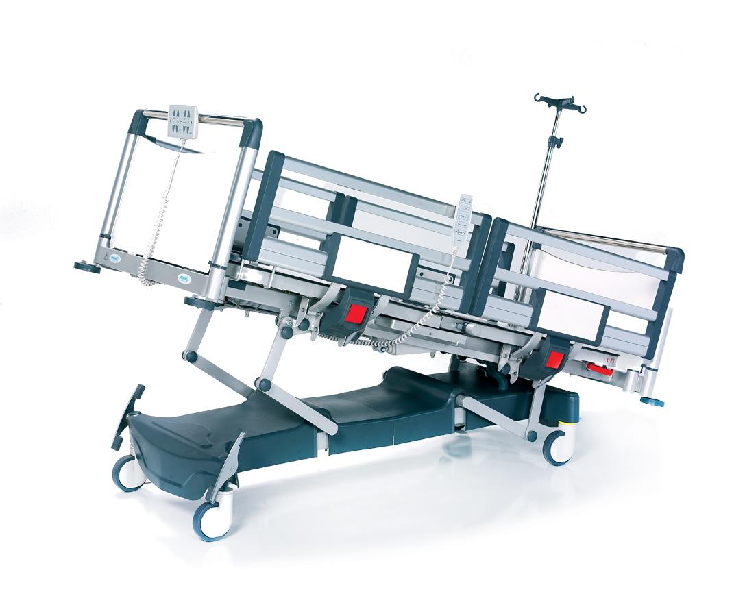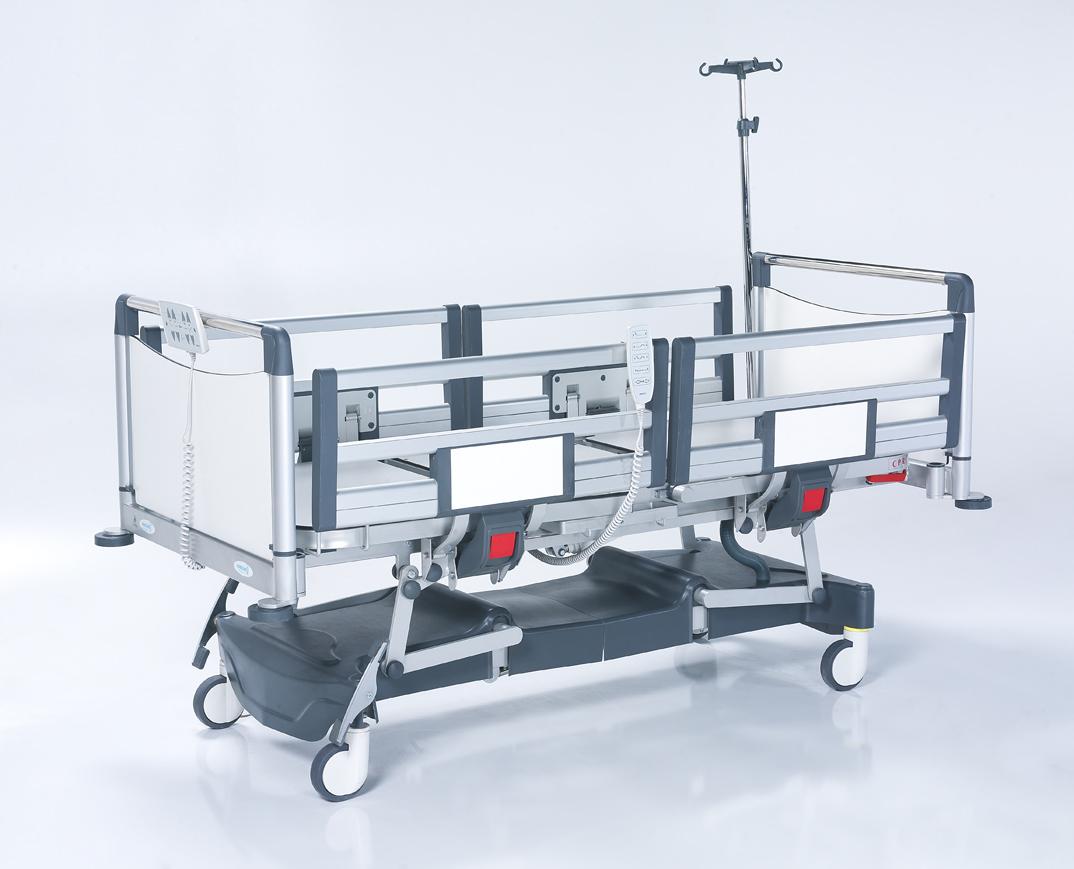 Кровать оснащена регулируемыми боковыми ограждениями, съемным изголовьем и изножьем, а также функциями Тренделенбурга и Анти-Тренделенбурга (по 16°). Поверхности выполнены из HPL, диаметр колес – 125 мм. Оснащена линейным тормозом, поворотом на 360°, механической системой CPR и телескопической инфузионной стойкой. Матрац в комплект не входит.
