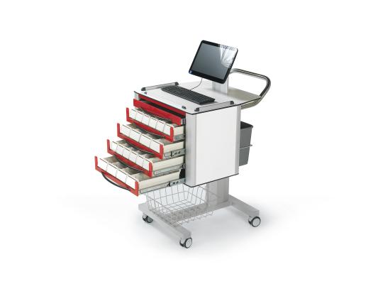 Тележка оснащена пятью выдвижными ящиками с съемными перегородками для удобной организации содержимого. Дополнительно предусмотрены контейнер для воды, отсек для хранения папок и металлическая корзина на раме.