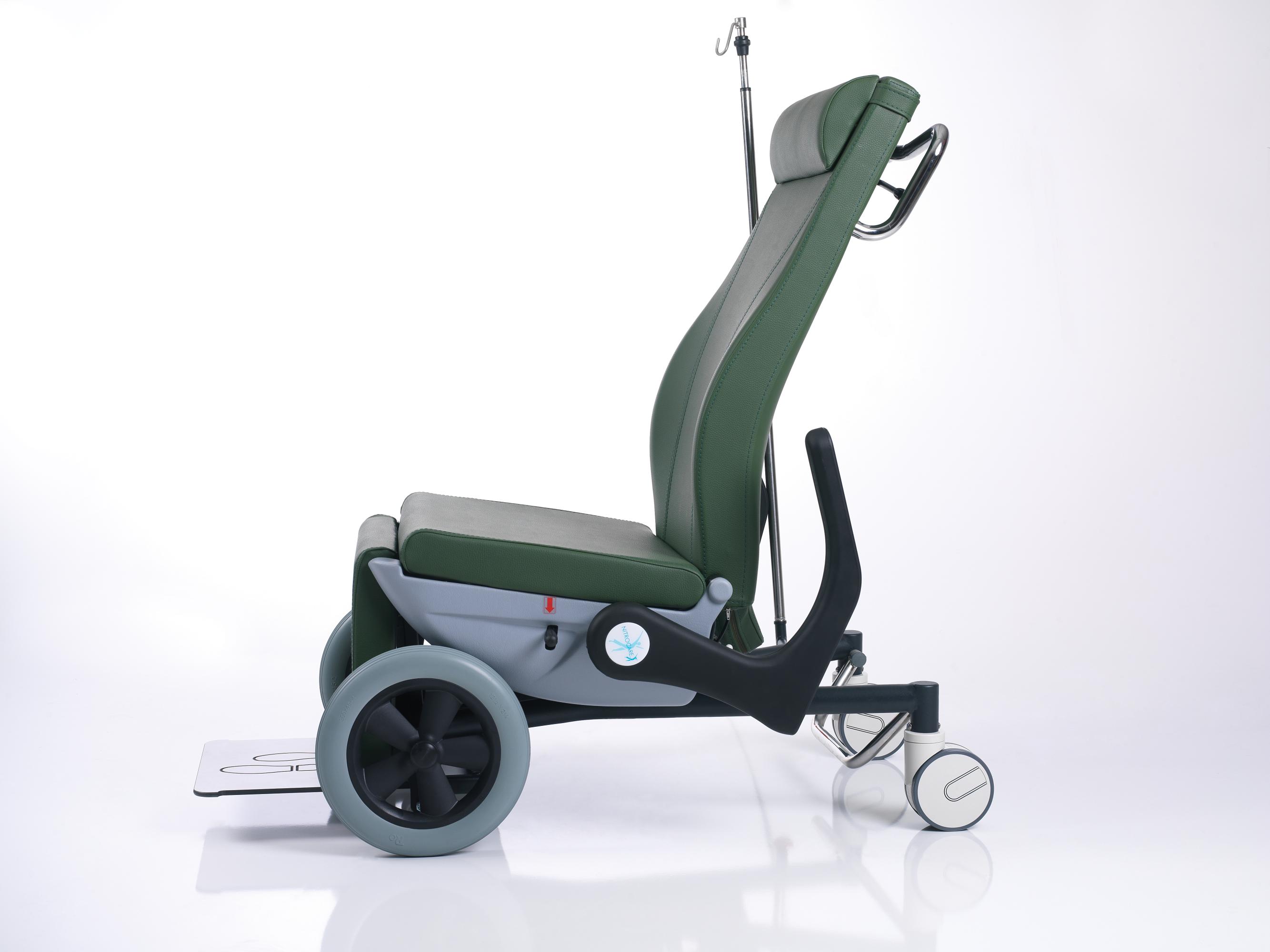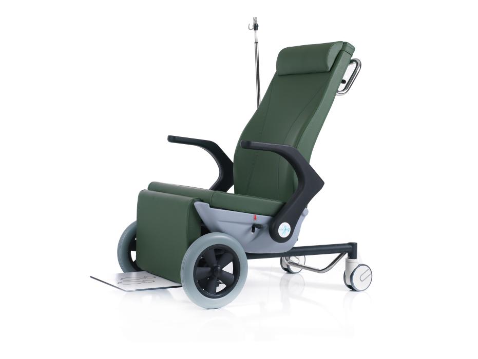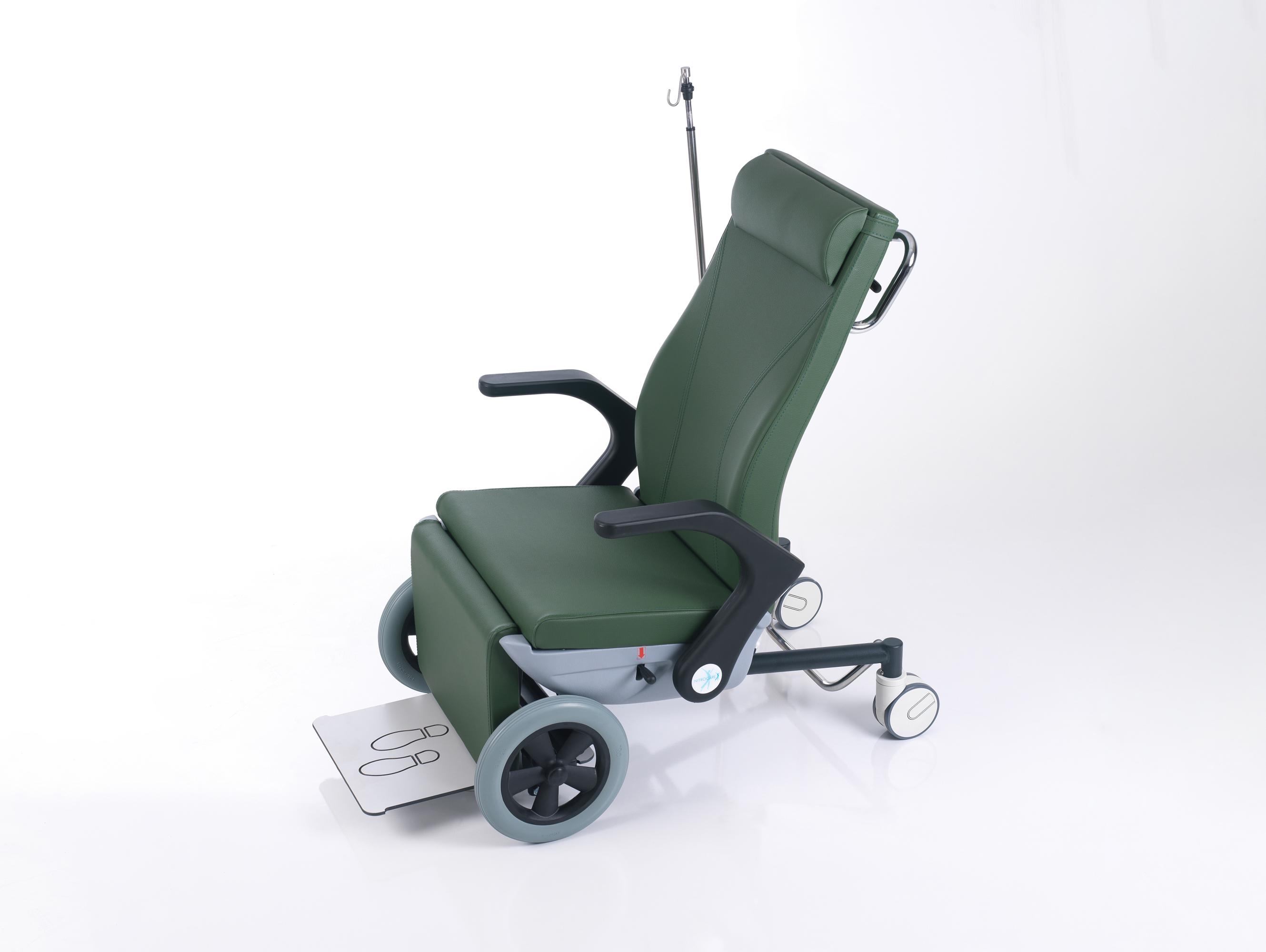 Поверхность кресла выполнена из полиуретана, а рама из нержавеющей стали гарантирует долговечность. Кресло имеет регулируемую спинку, подлокотники и подставку для ног, а также съемный подголовник и телескопическую инфузионную стойку.