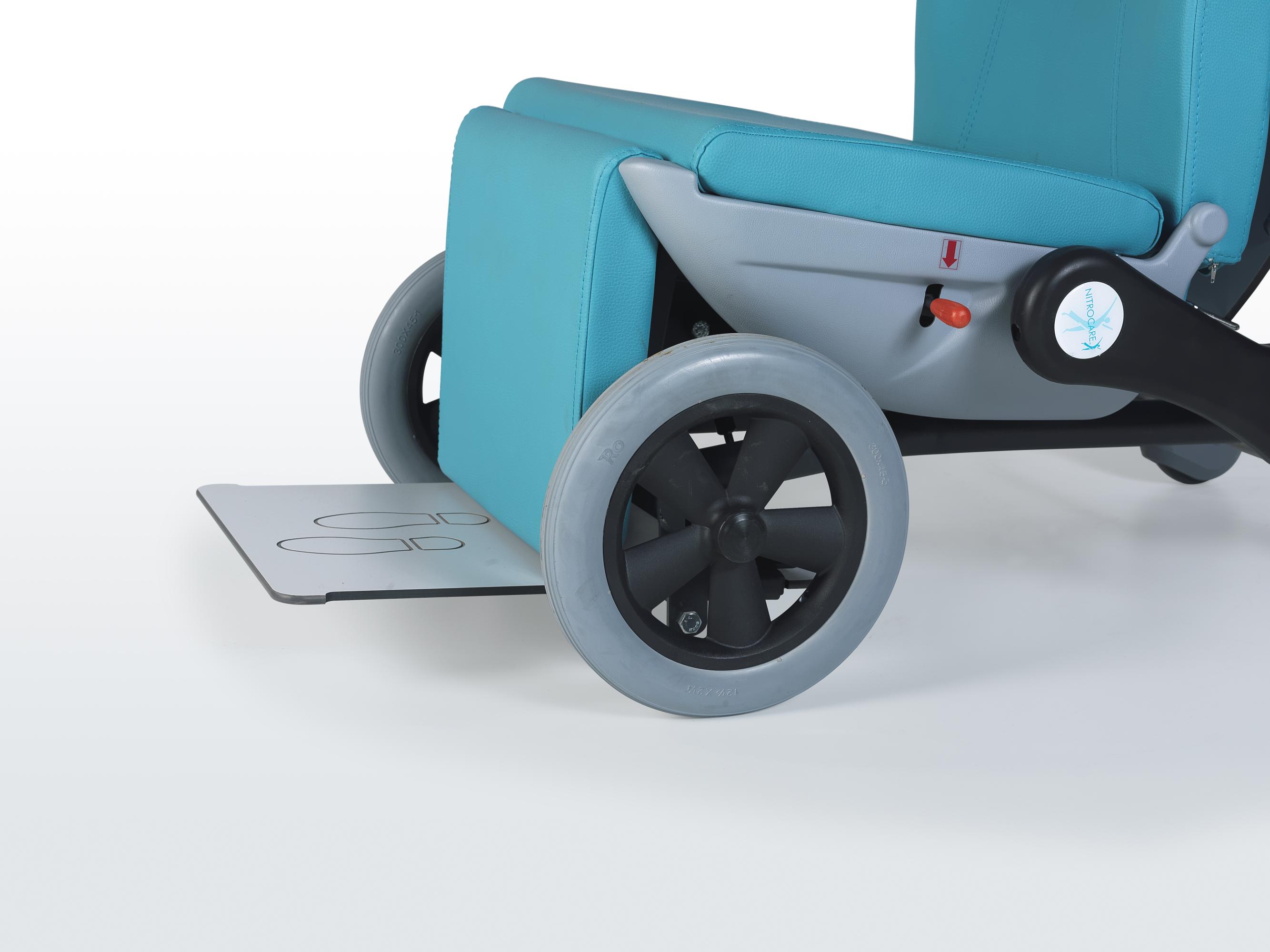 Размер кресла составляет 640 x 820 x 1120 mm, а грузоподъемность достигает 180 кг. Оно оснащено поворотом колес на 360º, передними колесами диаметром 300 mm и задними колесами диаметром 200 mm для отличной маневренности. Поверхность кресла выполнена из полиуретана, а рама из нержавеющей стали гарантирует долговечность.